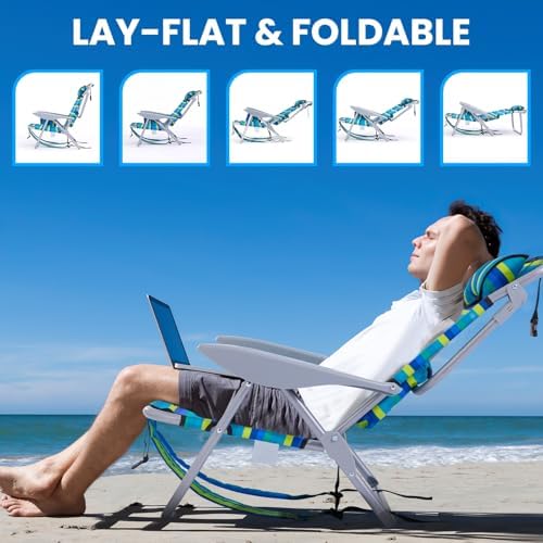2 Pack Lightweight Portable Camping Beach Chair for Adults, Outdoor Lay Flat Folding Beach Chairs with 5 Positions, Backpack Beach Chair with Towel Bar, Zipper Pouch, Cup Holder, Ocean Striped