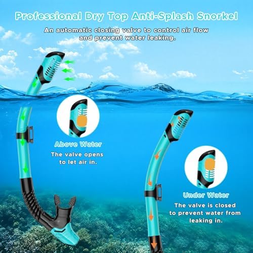 Upgraded Dry-Top Snorkel for Safer Breathing: The innovative dry-top snorkel features an automatic sealing valve that closes instantly when submerged, effectively preventing water from entering the breathing tube. Once back at the surface, the valve reopens for smooth airflow.This new valve system ensures reliable performance and clog-free operation—even when waves splash overhead, thanks to its built-in splash guard.