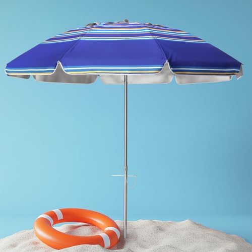 7ft Beach Umbrella with Sand Anchor & Tilt, UPF 50+ Protection Beach Umbrellas for Sand, Beach Umbrellas for Heavy Duty Wind Portable with Carry Bag, for Patio Garden Pool, Dark Blue Stripes(Random pattern)