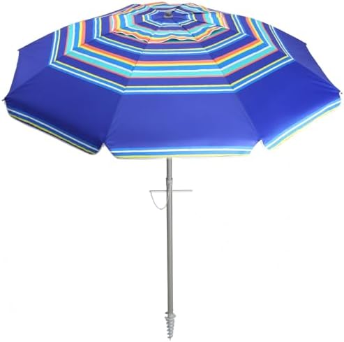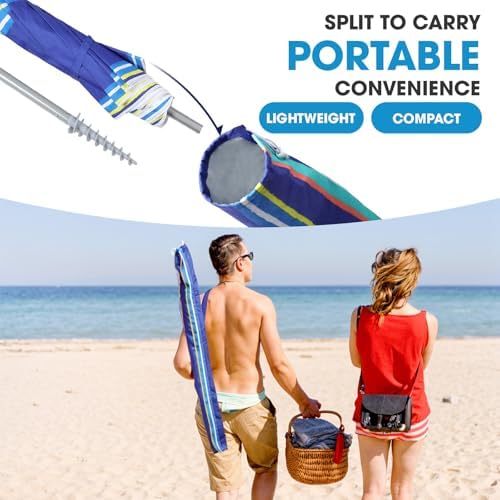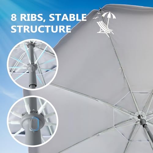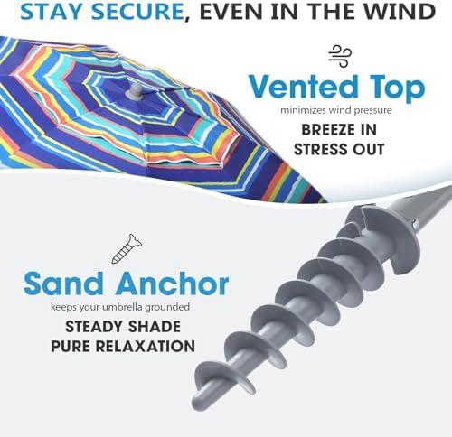WINDPROOF DESIGN WITH SAND ANCHOR: Built with 8 high-strength fiberglass ribs, this beach umbrella offers superior wind resistance, ensuring it withstands strong breezes. The sturdy aluminum powder-coated iron pole provides long-lasting support and prevents rust, enhancing the overall lifespan of beach umbrellas for sand. The upgraded sand anchor is designed to securely anchor into the ground, offering added stability