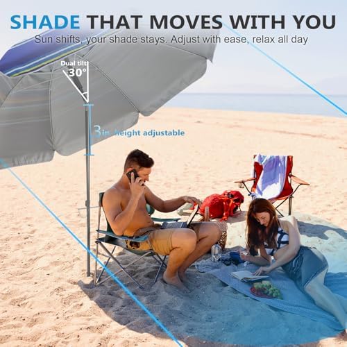 USER-FRIENDLY ADJUSTMENTS: The beach umbrella features a dual tilt mechanism, allowing you to easily adjust the height and angle (up to 30 degrees left or right) without having to reposition the entire base. Additionally, the beach umbrellas for sand portable open and close with ease, allowing you to set up or pack away in just moments, making them the great solution for all-day outdoor comfort