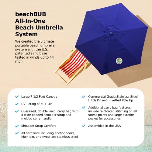 ASSEMBLED IN THE USA: This outdoor umbrella and base are assembled and inspected in North Carolina. In 2009, the beachBUB Base was invented in Naples, Florida. Thousands of designing, engineering, and testing hours have brought us to our 2024 All-In-One model of the beach umbrella system. It has evolved with input from hundreds of everyday beachgoers like you, and we are thankful to have this helpful feedback.
