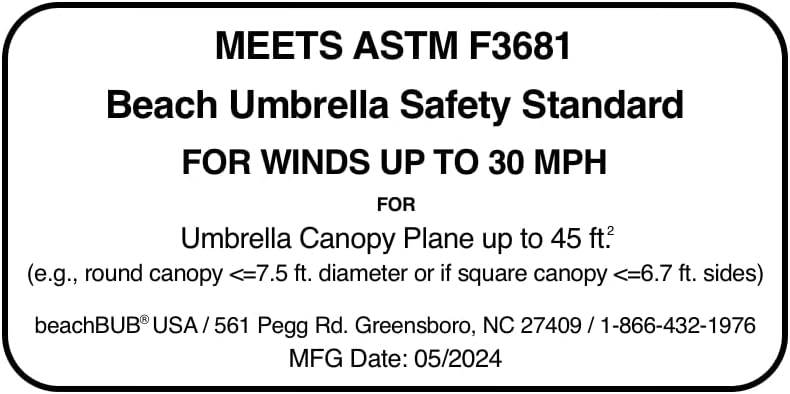 THIS UMBRELLA INCLUDES THE ULTRA BASE WHICH IS COMPLIANT WITH THE ASTM F3681-24 BEACH UMBRELLA SAFETY STANDARD: Engineers from the Consumer Product Safety Commission have determined that for a 7½’ umbrella to be safe it must incorporate 75 lbs of resistance at the bottom pole. This was found to be effective in securing an umbrella in winds up to 30 mph.