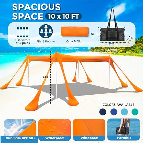 Multi-purpose Beach Sun Shelter: The lightweight umbrella beach tent pop up shade is only 9.3lb, is very portable to carry. It’s designed to fit into most car trunks, allowing you to take it wherever you go. This cool cabanas beach canopy 10×10 can easily become your preferred companion for beach days, park outings, picnics, fishing trips, music festivals, field training, vehicle shading, outdoor adventures and even rock campsites