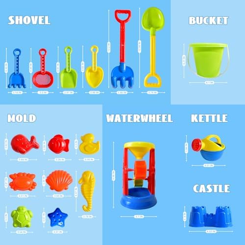 Beach Toys, 19 Piece Sand Toys Set Kids Sandbox Toys Includes Water Wheel Beach Tool Kit Bucket Watering Can Molds with Mesh Bag for Kids Ages 3-13