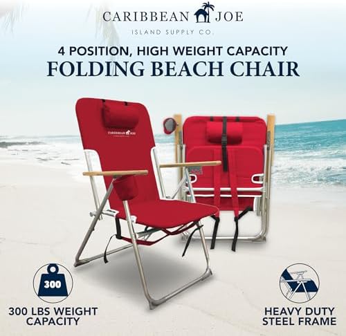 Caribbean Joe Folding Beach Chair, 4 Position Portable Backpack Foldable Camping Chair with Headrest, Cup Holder, and Wooden Armrests, 300 lb Capacity