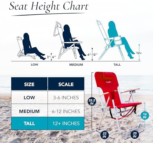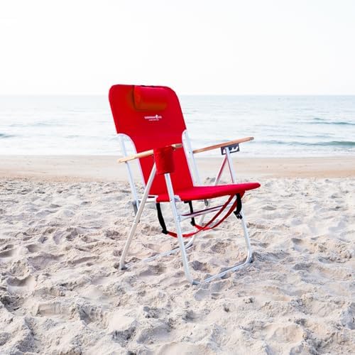 FOUR POSITION DELUXE BEACH CHAIR: This compact outdoor beach chair with backpack straps and armrests is perfect for sitting back and relaxing on the sand or grass, making it perfect for taking to the beach, park, camp site, or even in your own yard; includes head rest and cup holder, measures 25 W x 23 D x 35.5 H (in inches), high weight capacity of 300 lbs