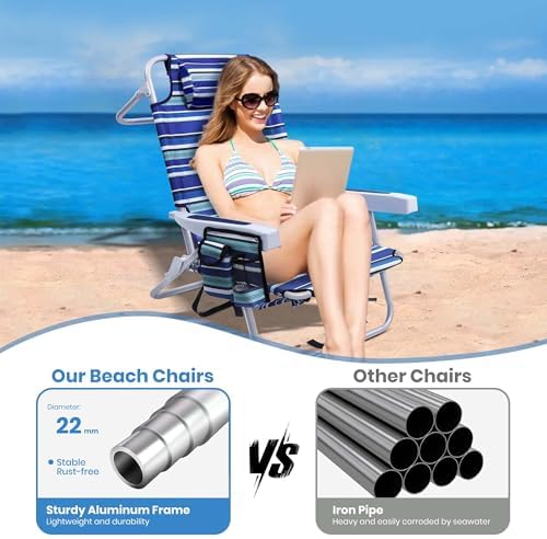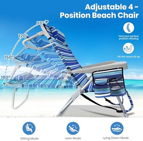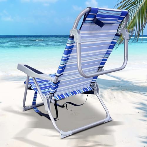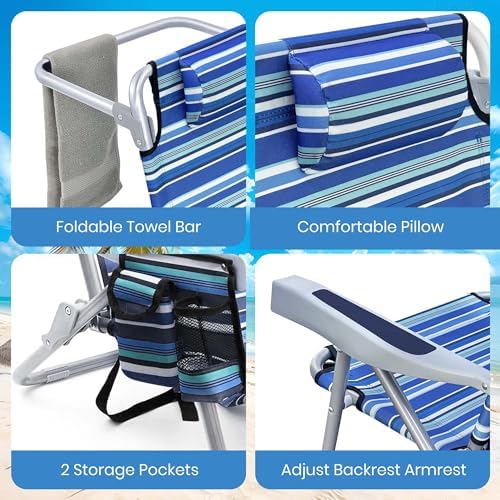 GVDV Backpack Beach Chairs for Adults, Portable Lay Flat Folding Chair with Cup Holder and Towel Bars, 4-Position Adjustable Reclining Chair for Beach, Camp, Outdoor