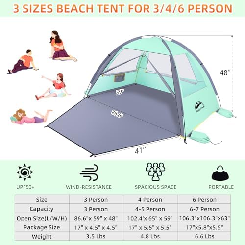 【Roomy Space & Portable】The tent for beach dimensions upgraded to 86.6*59*48inch(220*150*122cm) and can suit for 3 people or with friends family enjoy beach day , But the size after storage is only 17*4.5*4.5 inches and a weight of just 3.5lbs, Great for putting in your suitcase when traveling or taking on a plane.And the beach shade setup less than 3 minutes to set up, reducing your trouble in the wind,It’s a beach essentials for your beach day !