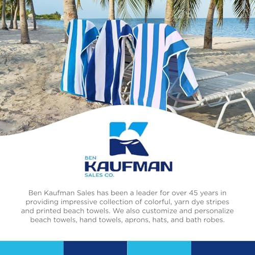 Elevate your pool, bathroom, and beach experience with Ben Kaufman Cabana Stripe Beach & Pool Towel. Our oversized beach towels are crafted from high-quality fabric, ensuring you stay dry and cozy—whether you’re lounging on the sand or stepping out of the shower. These luxury cotton towels dry fast, making them excellent companions for frequent swimmers and travelers who need a quick-drying solution. Whether you’re looking for a single beach towel or a bulk set of towels for the whole family, our assortment offers a range of striped colored towels that maintain their vibrant hues even after multiple washes. With exceptional absorbency and a soft cotton touch, Ben Kaufman’s towels are the quintessential addition to your beach gear, bathroom, or travel bag, ensuring you’re always prepared for your next water-bound escape. At Ben Kaufman Sales Company, we are obsessed with creating and offering high quality, innovative towel and cloth products at great value and outstanding service. We’ve been providing our customers with inventive collections of beach and bath towels, and beach accessories since 1976. With over 45 years in the textile business, our commitment to deliver customer satisfaction is our top priority. We have the unique capability of providing custom embroidery here in the USA at no additional charge to our customers. Our embroidered towels offer a personal design and look to the product which enhances its value to your customer because it lasts a lifetime and is a unique design feature not available elsewhere.