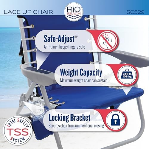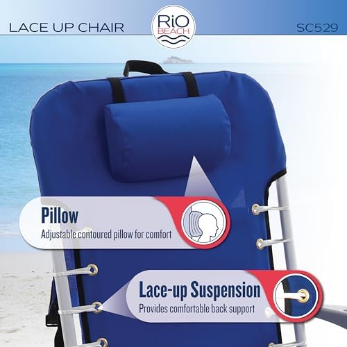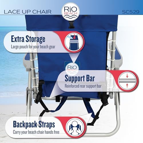 Add fashion and function to your folding beach chair with the Rio Beach 4-Position Lace-Up Backpack Beach Chair. This unique chair features adjustable backpack straps for easy transport. The lace-up suspension adds nautical style to this sand chair and provides all-day comfort by conforming to your body. The beach chair’s frame is constructed from a durable and lightweight rust-proof aluminum. This lightweight chair weighs only 8 lbs. The fabric used on the reclining beach chair is constructed of thick, high-quality 600 denier fabric made to withstand every day usage. Relax by the pool or at the beach comfortably with the unique design of this 4-position beach chair. Standard beach chairs sit 8 ½ inches off the ground. The lace-up chair provides a higher seating option at 11 inches off the ground, making it easier to get in and out of. The wider, molded armrests provide comfort to elbows and forearms. With SAFE ADJUST, easily recline to one of four positions without the worry of getting your fingers or hands caught in the brackets. A locking bracket prevents the camp chair from tilting or folding while in use and reinforces the chair seat frame for a stronger, more durable chair. A large storage pouch on the back of the folding beach chair has plenty of storage space to carry your beach accessories and beach towel. The interior hook and loop fastener pocket keeps little things in place. When you’re ready to pack up and go, secure the main pouch with the adjustable buckle straps to keep your personal items in place. The large, adjustable foam pillow supports your neck while the convenient seat-side cup holder keeps your favorite beverage within arm’s reach. The Rio 4-Position Lace-Up Suspension Backpack Chair is perfect for the beach, camping, hiking, outdoor concert, or anywhere you need a comfortable, all-day seating option! WEIGHT CAPACITY: 240 lbs. PRODUCT WEIGHT: 8 lbs. OPEN DIMENSIONS: 44.7″ x 25.5″ x 26.5″ FOLDED DIMENSIONS: 42.8″ x 25.5″ x 5.1″