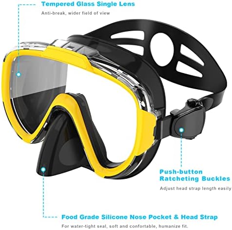 【Safe, Comfortable & Adjustable Head Strap】Durable silicone head strap has secure ratcheting buckles, mask strap clip features a quick-release design to allow the snorkel and diving mask to be separated quickly. Snorkel set has an adjustable and serrated adjustment strap that can be adjusted to fit over your head and to fit different face shapes. Snorkeling mask is specially designed for children and adults so that it conforms to their face and prevents water from getting into their eyes.