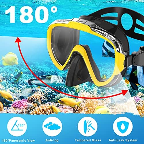 【180° Panoramic Design, Snorkeling Mask and Snorkel tube Set of 2 in 1】HD durable impact-resistant anti-fog lenses, dry top silicone snorkel, travel gear bag. Our snorkel set provides you a 180 degree field of vision, and offers superior views for beautiful underwater adventures. Our snorkeling set has the gear you need for snorkeling to help you explore the underwater world cheerfully.