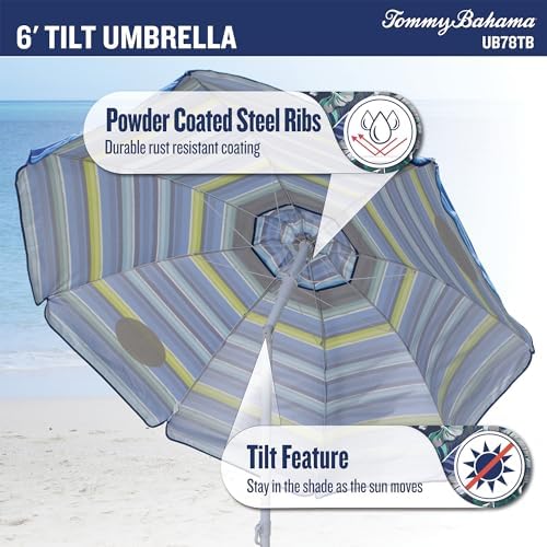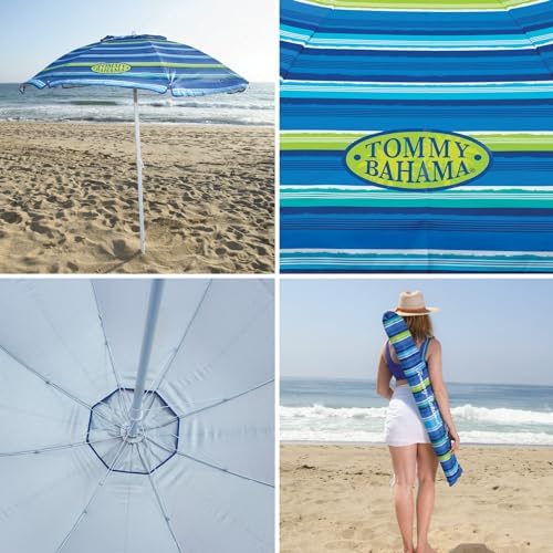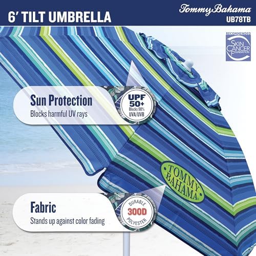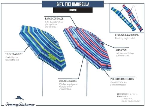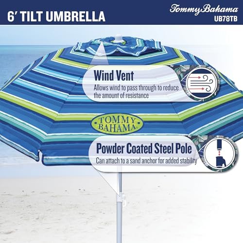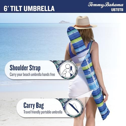 Tommy Bahama 6′ UPF 50+ Tilt Beach Umbrella with Integrated Sand Anchor, Wind Vent, and Carry Bag